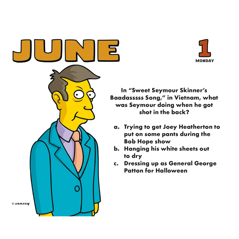 Elke dag in deze Simpsons bureaukalender bevat leuke en levendige afbeeldingen en trivia van Springfields favoriete familie, The Simpsons. Het beeldmateriaal omvat Homer, Marge, Bart, Lisa en Maggie om er maar een paar te noemen. Deze scheurkalender is ontworpen om plat neer te leggen, echter de hoes kan ook dienen als standaard voor uw bureau.